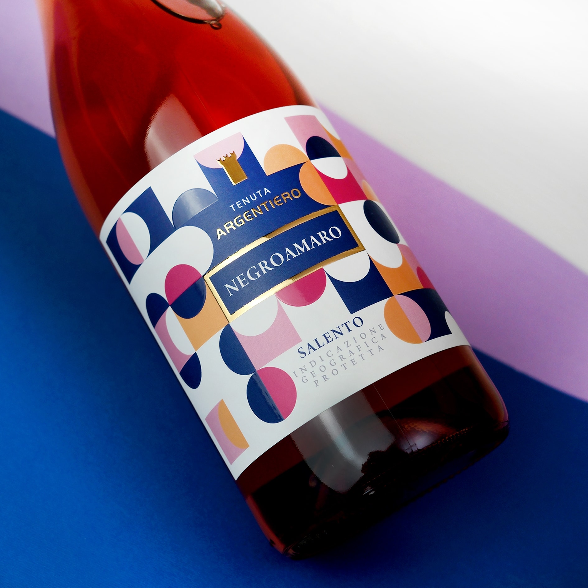 Per conferire maggiore pregio all’etichetta si è deciso di stampare con nero serigrafico che da al tatto un effetto “gommato”. Le parti in viola sono stampate in lamina lucida.